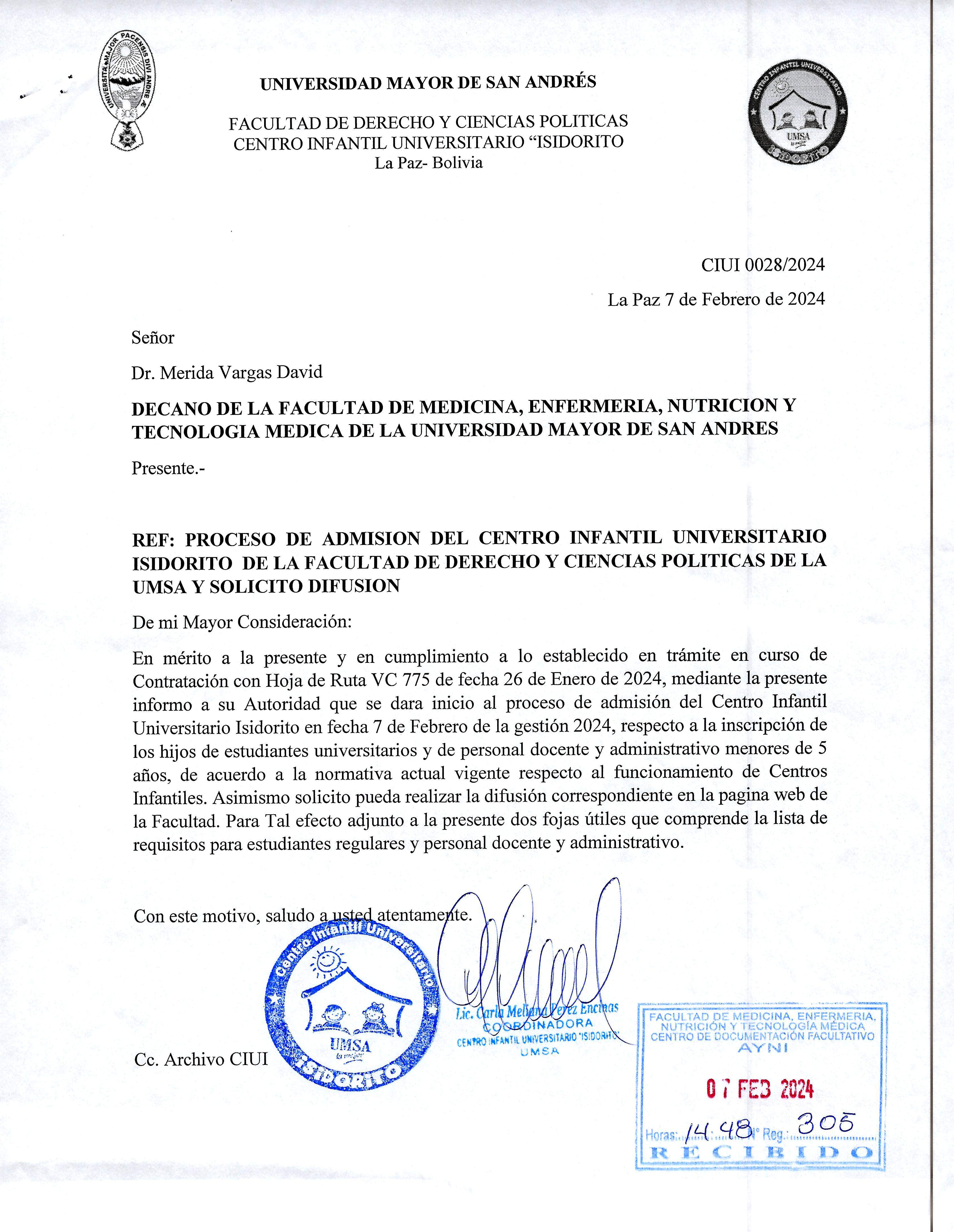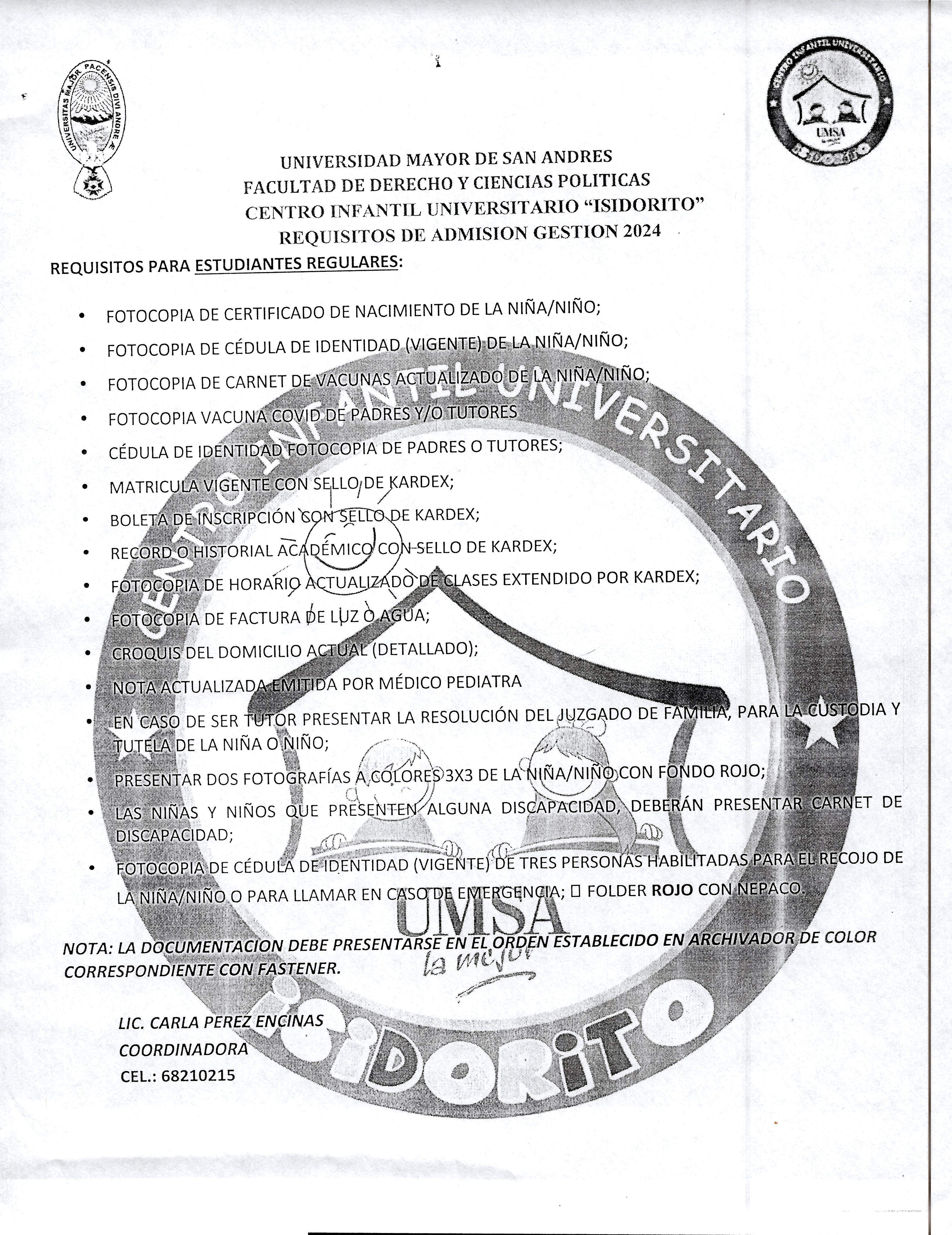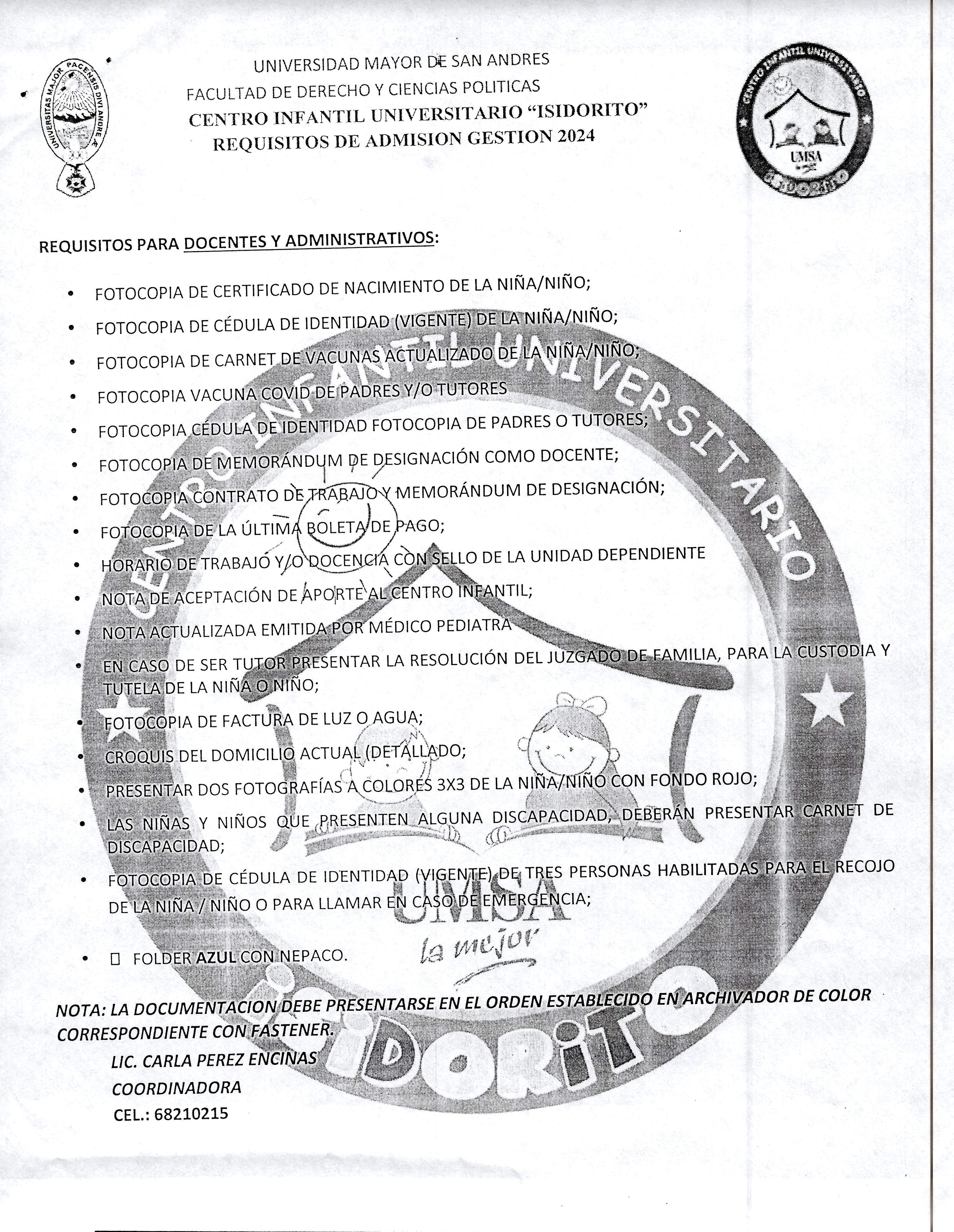 PROCESO DE ADMISIÓN DEL CENTRO INFANTIL UNIVERSITARIO ISIDORITO - FMENT-UMSA