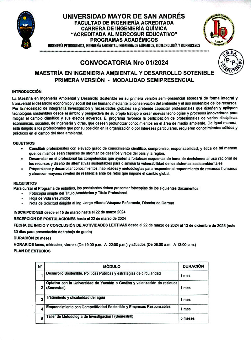 MAESTRÍA EN INGENIERIA AMBIENTAL Y DESARROLLO SOTENIBLE PRIMERA VERSIÓN - MODALIDAD SEMIPRESENCIAL GESTIÓN ACADÉMICA 2024