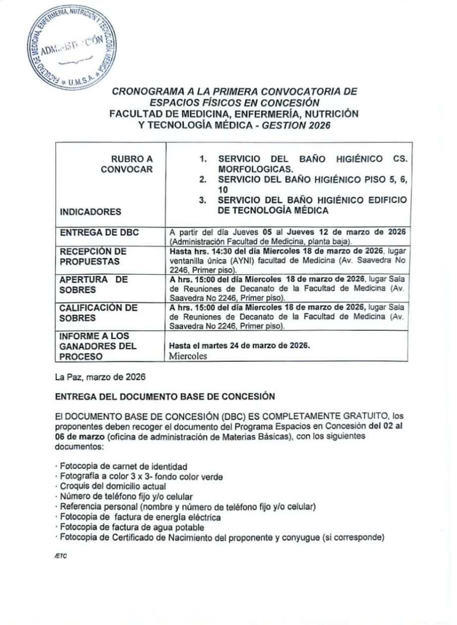 Convocatoria 2026 para concesión de baños higiénicos en Facultad de Medicina. Incluye cronograma y r...